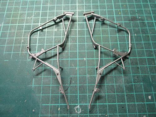 組立説明書の指示は無視してまずは気になるフレームを切り出しました 不用なステーが片側に成型されています(^^;) パーティングラインを念入りに削りました。 両面テープで仮組しました ここまでで一日かかりました。 完成まで、なかなか楽しめそうなキ…